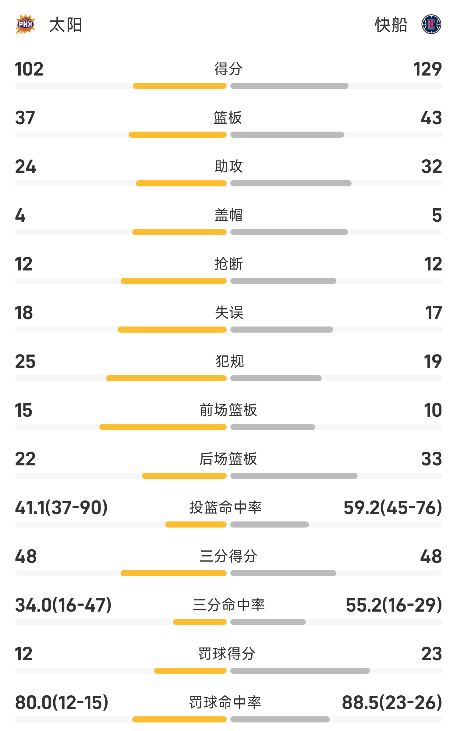 6686体育平台10月25日讯 25/26赛季NBA 常规赛,快船对阵太阳。双方全场战罢,快船129-102战胜太阳。哈登砍下全场最高的30分7板7助,率领快船胜利取胜。