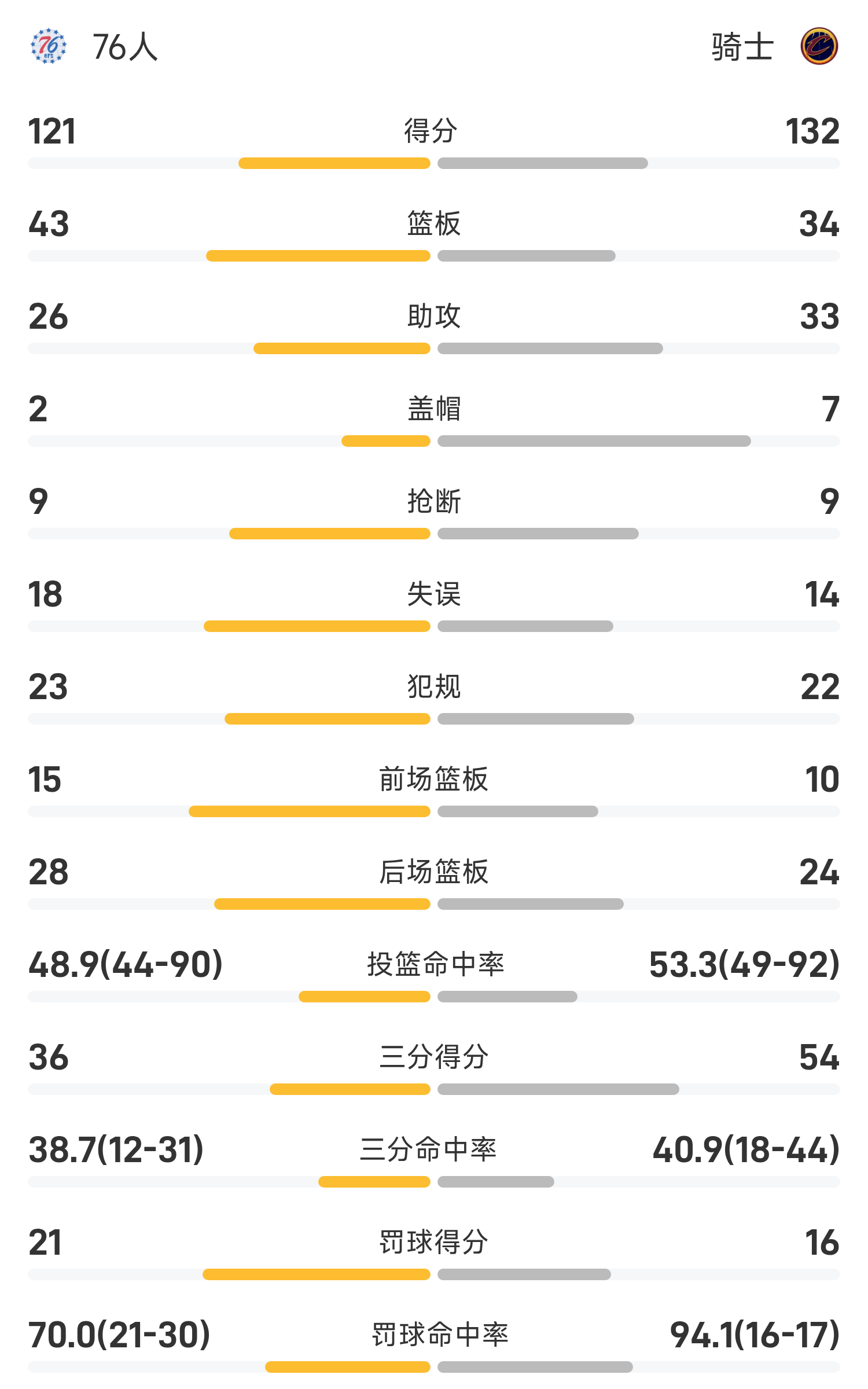NBA战报:米切尔46分8助,骑士132-121击败76人