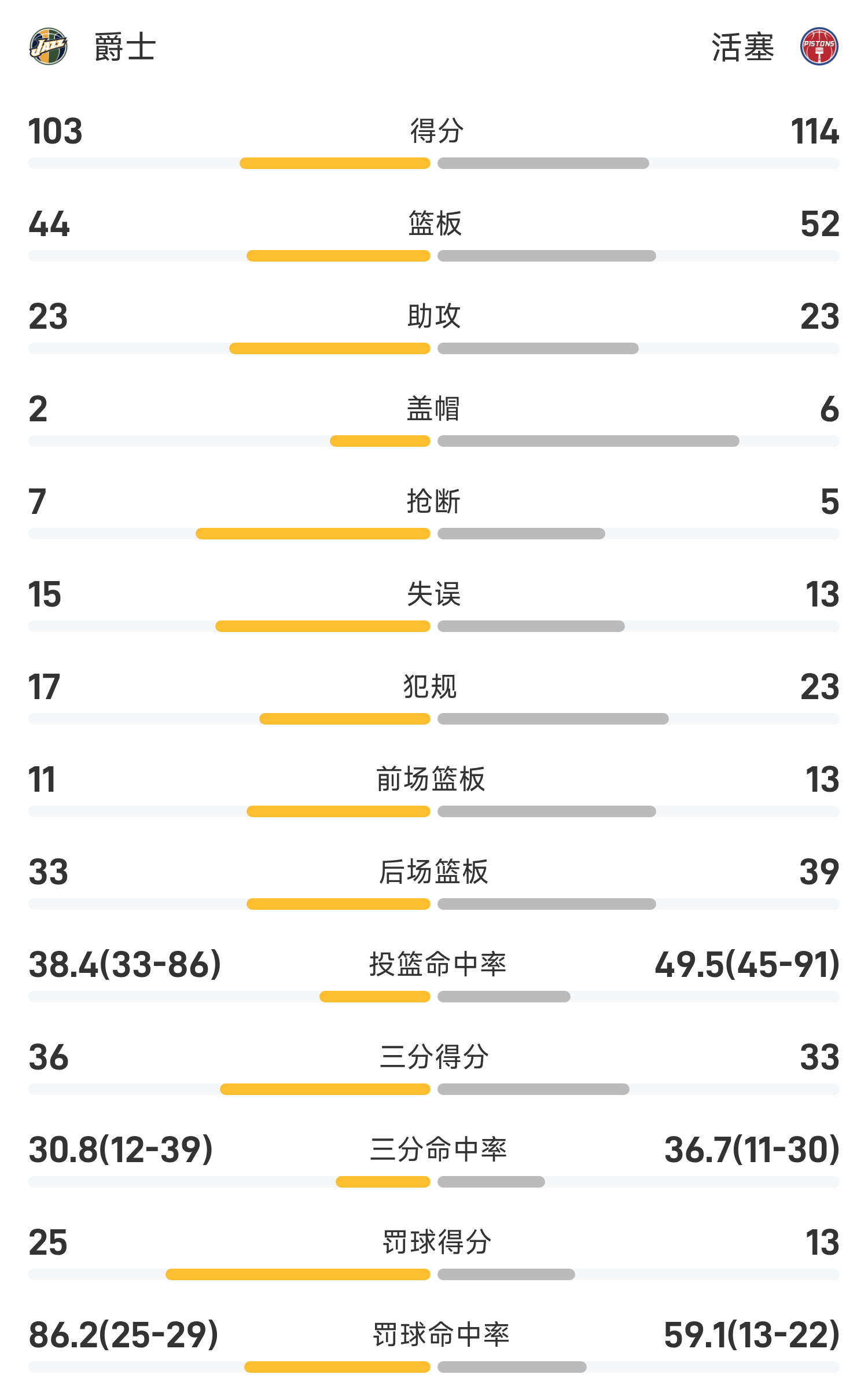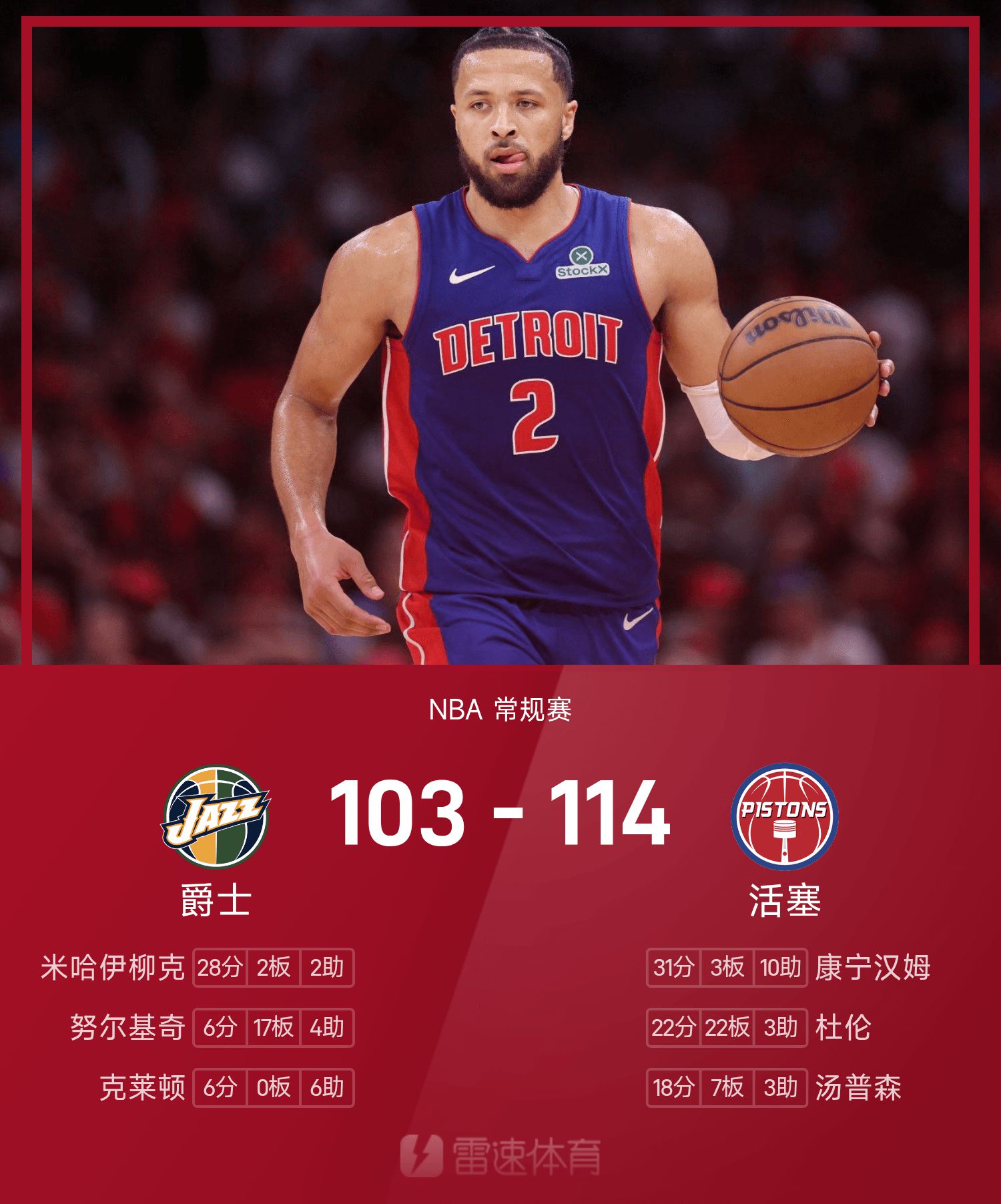 NBA战报:康宁汉姆31分10助,活塞114-103爵士