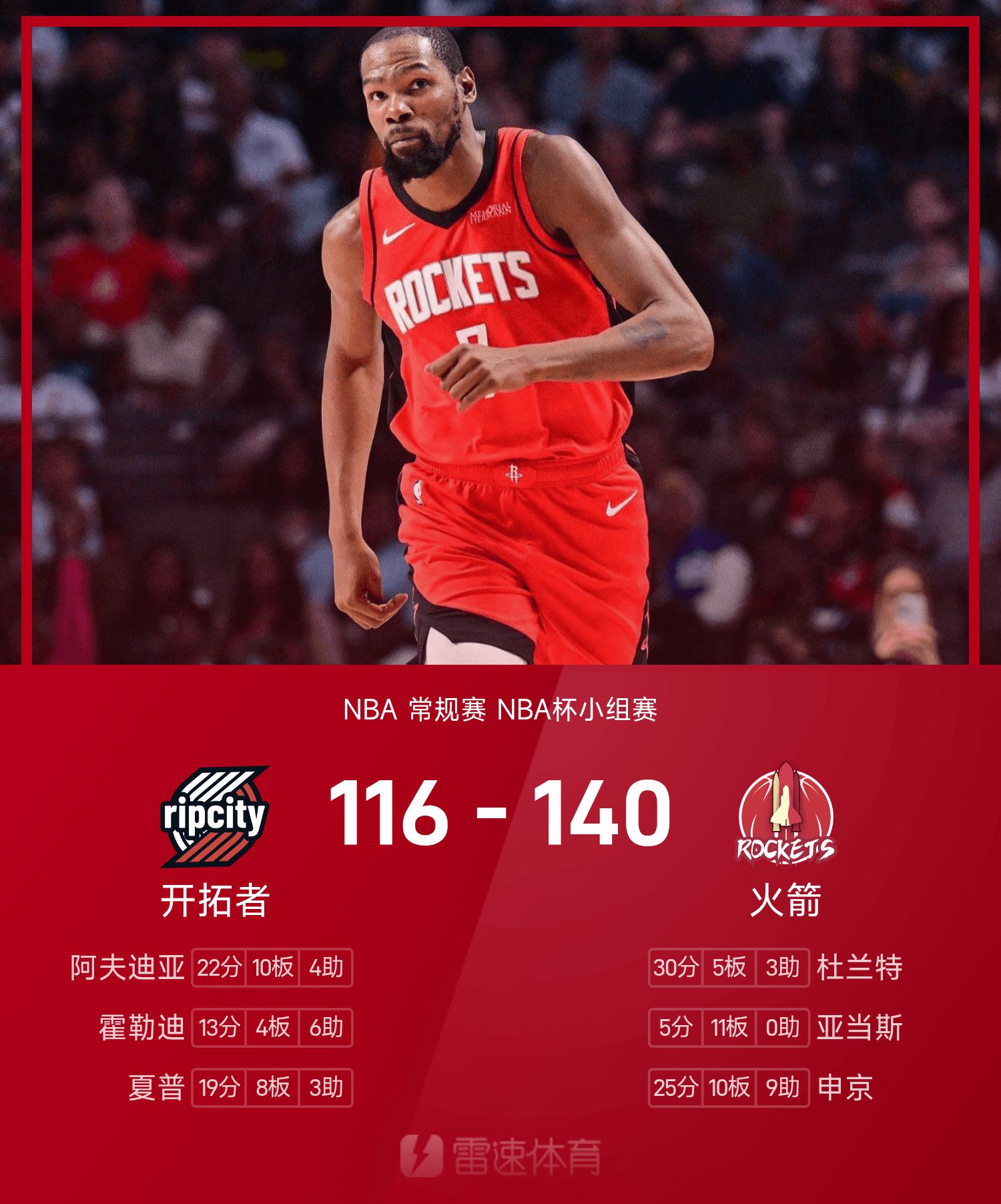 6686体育平台11月15日讯 25/26赛季NBA 常规赛 NBA杯分组赛,火箭对阵开拓者。双方全场战罢,火箭140-116战胜开拓者。杜兰特砍下全场最高的30分5板3助,率领火箭胜利取胜。