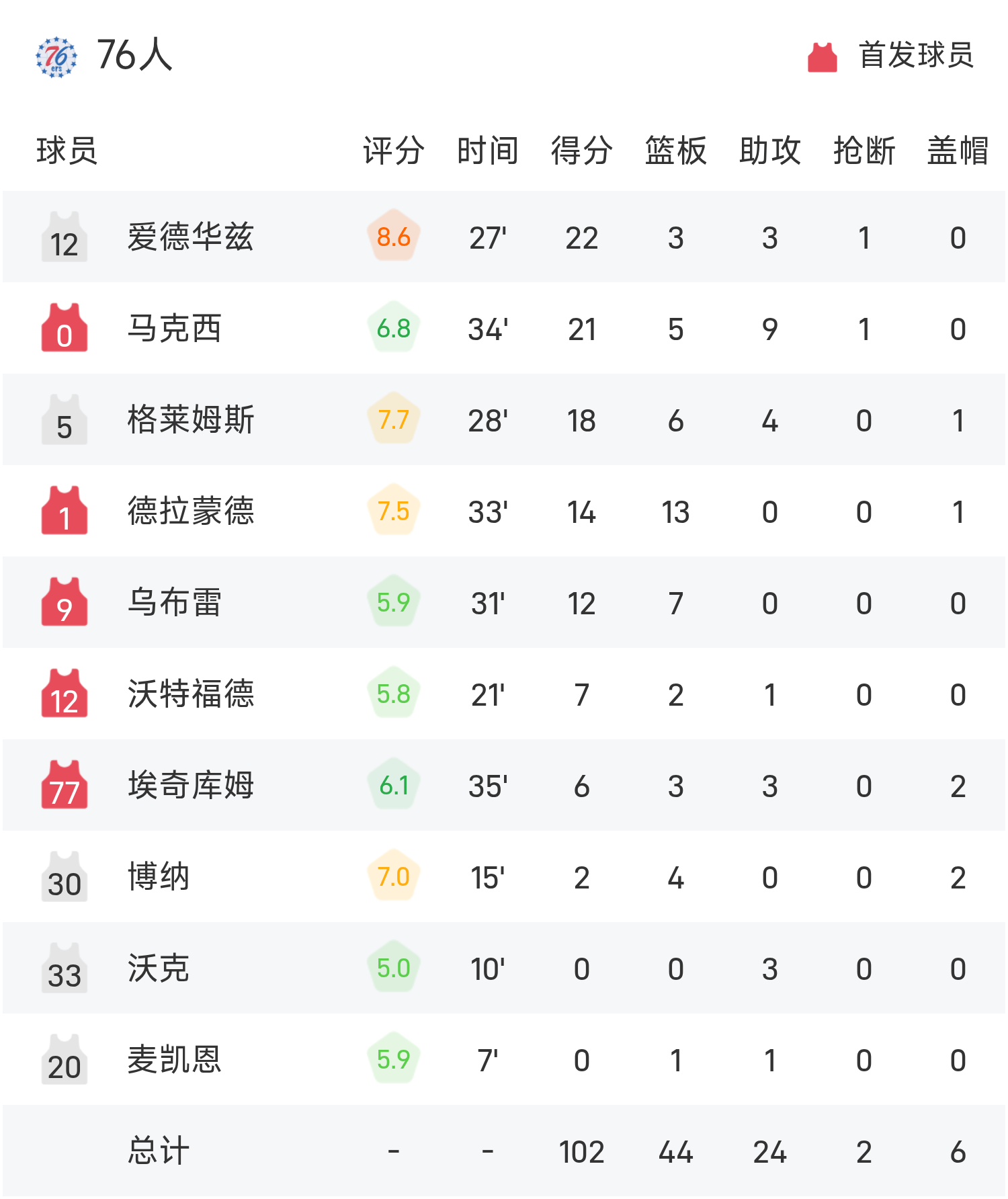 爱德华兹得到22分3板3助率队取胜,布朗空砍全场最高的24分6板5助。