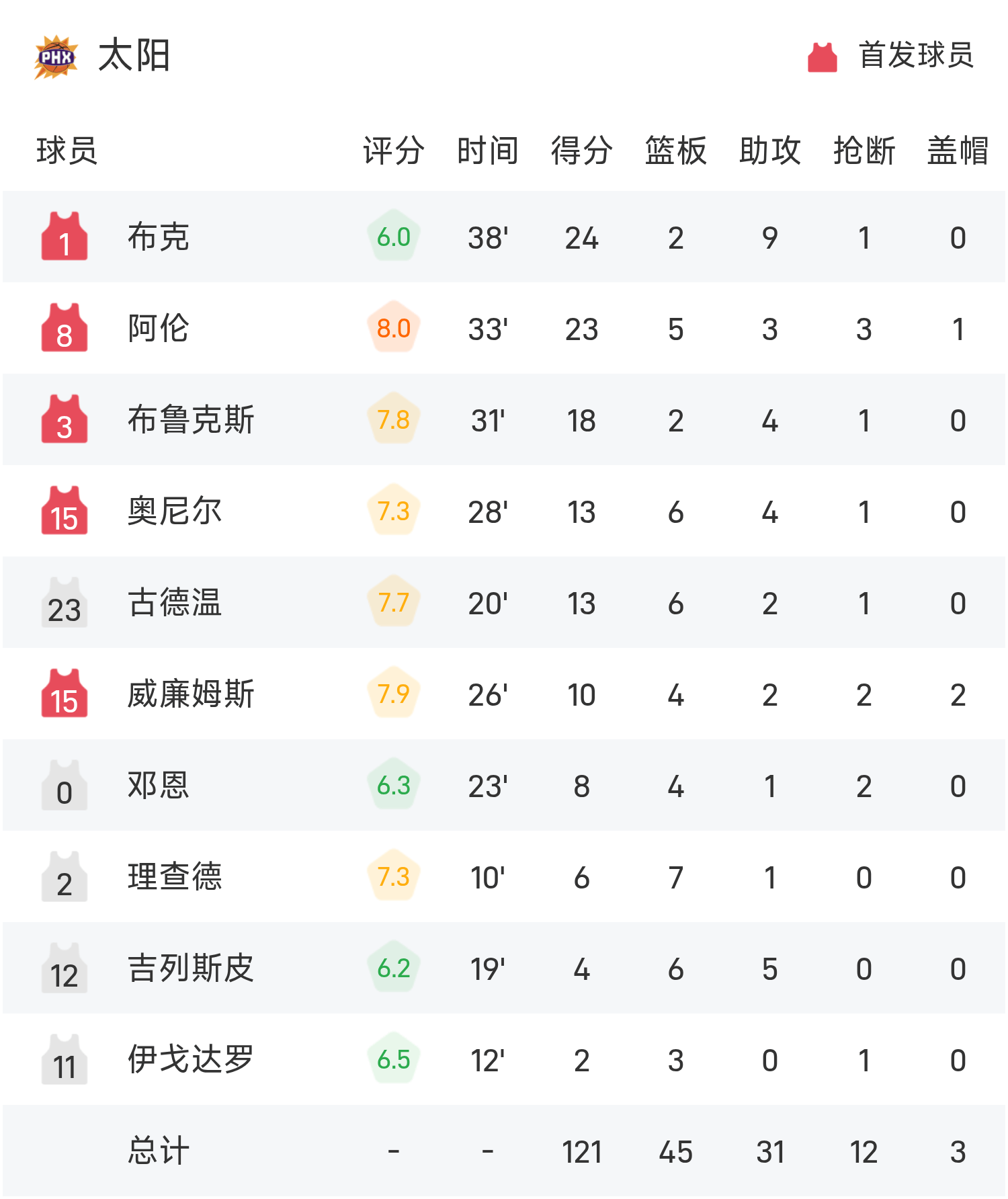 布克砍下全场最高的24分2板9助,率领太阳胜利取胜。
