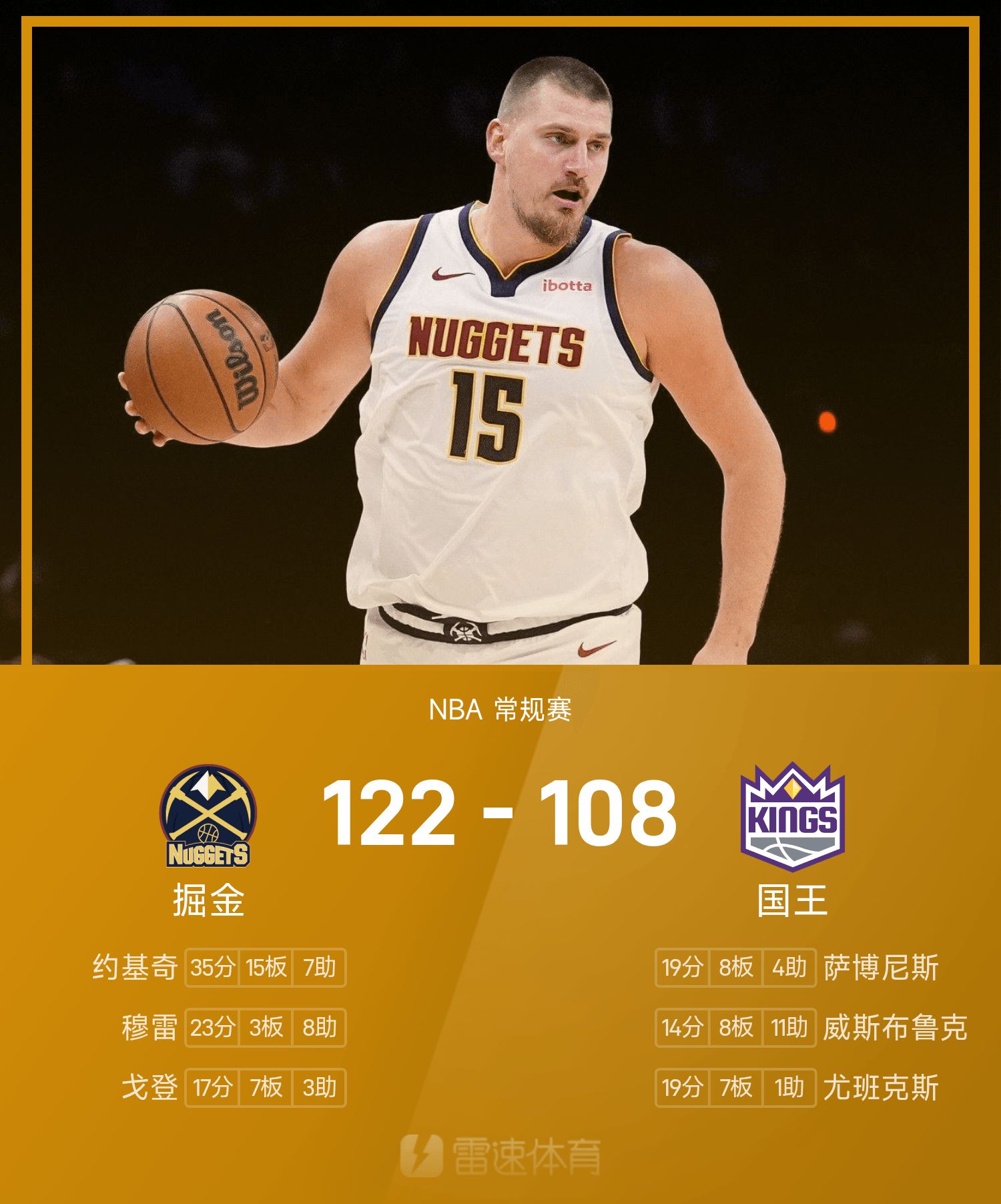 约基奇轰下35分15板7助攻,威少砍下准三双仍无济于事,掘金轻取国王。