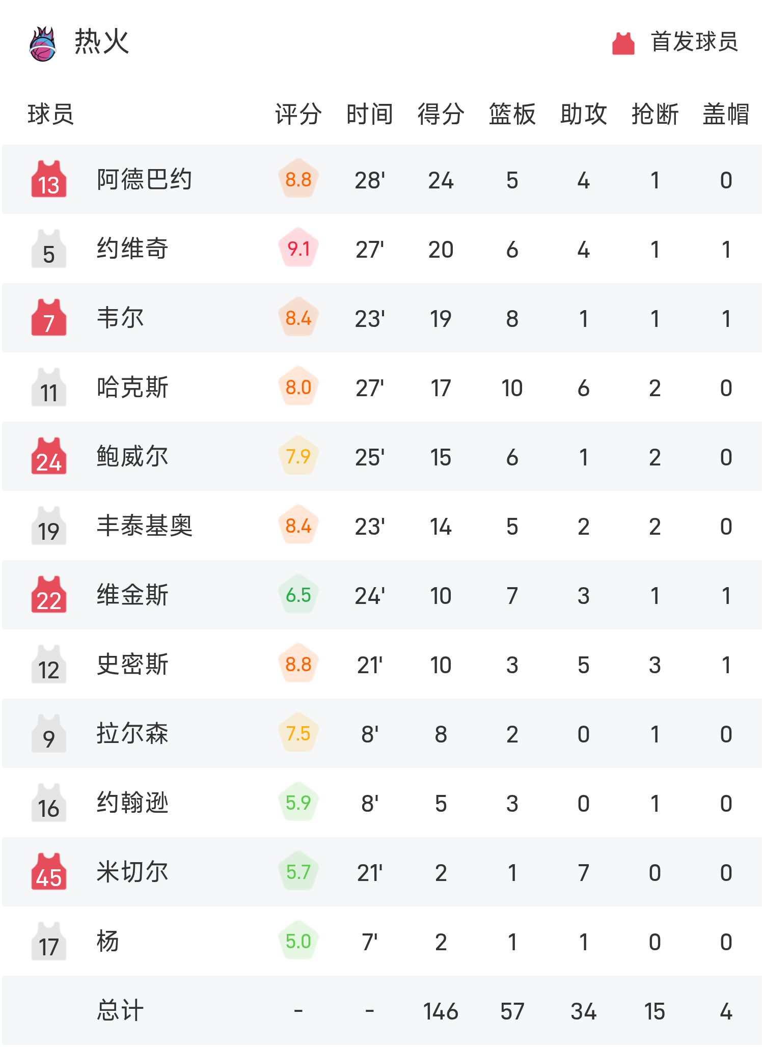 6686体育平台10月25日讯 25/26赛季NBA 常规赛,灰熊对阵热火。双方全场战罢,灰熊114-146不敌热火。阿德巴约砍下全场最高的24分5板4助,率领热火胜利取胜。