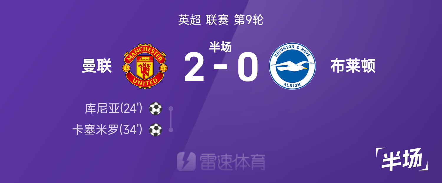 英超半场:库尼亚斩获红魔处子球,曼联暂2-0布莱顿