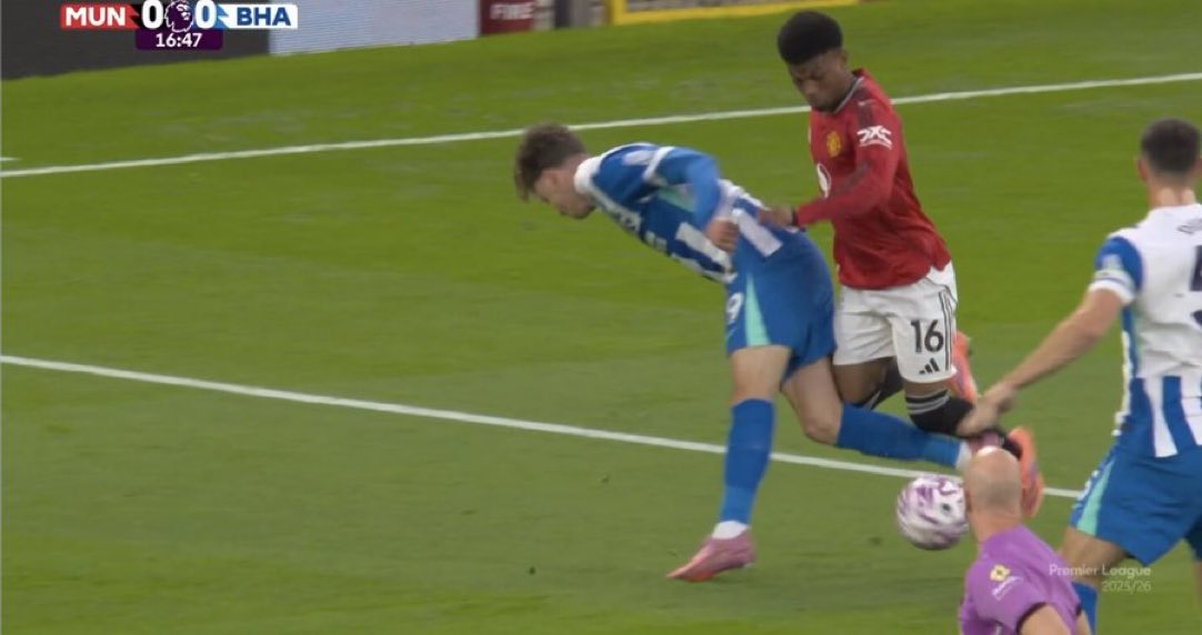 6686体育平台10月26日讯 英超第9轮,曼联暂时2-0领跑位布莱顿。竞赛第15分钟,阿马德突入三秒区内被德库耶佩放倒,裁判员并未做出裁决。