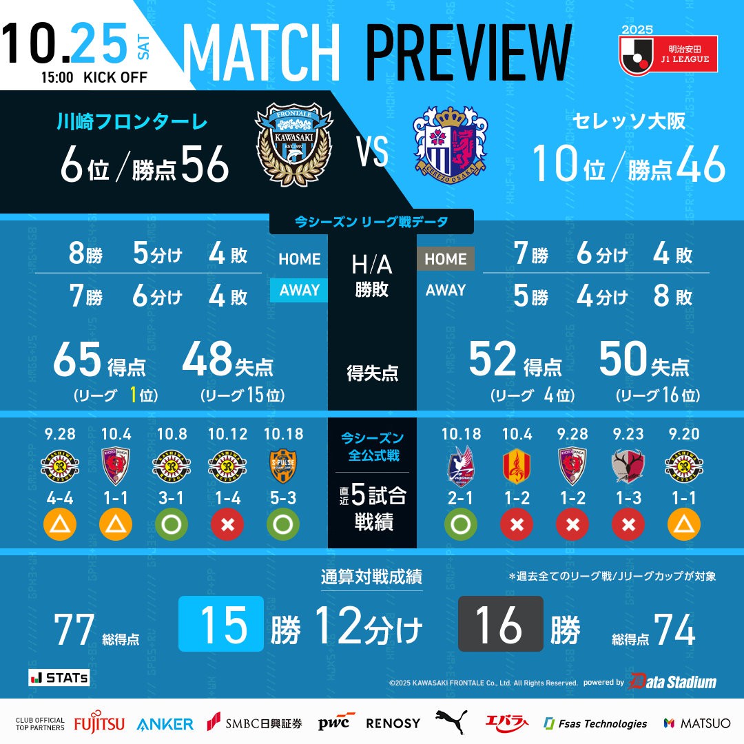 6686体育平台10月25日讯 日职联第35轮,大阪樱花主队场迎战川崎前锋。